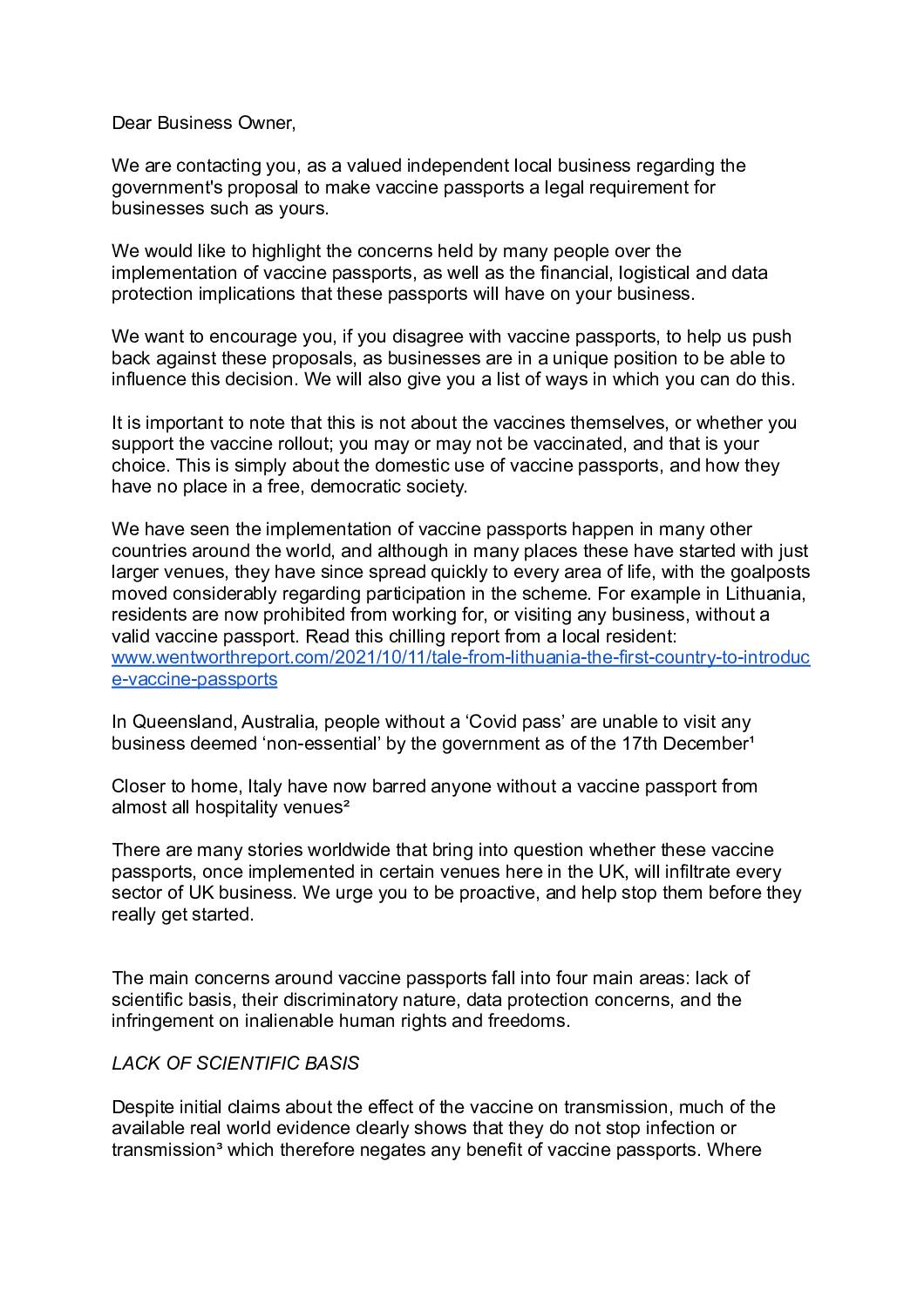 We are contacting you, as a valued independent local business regarding the government’s proposal to make vaccine passports a legal requirement for businesses such as yours.